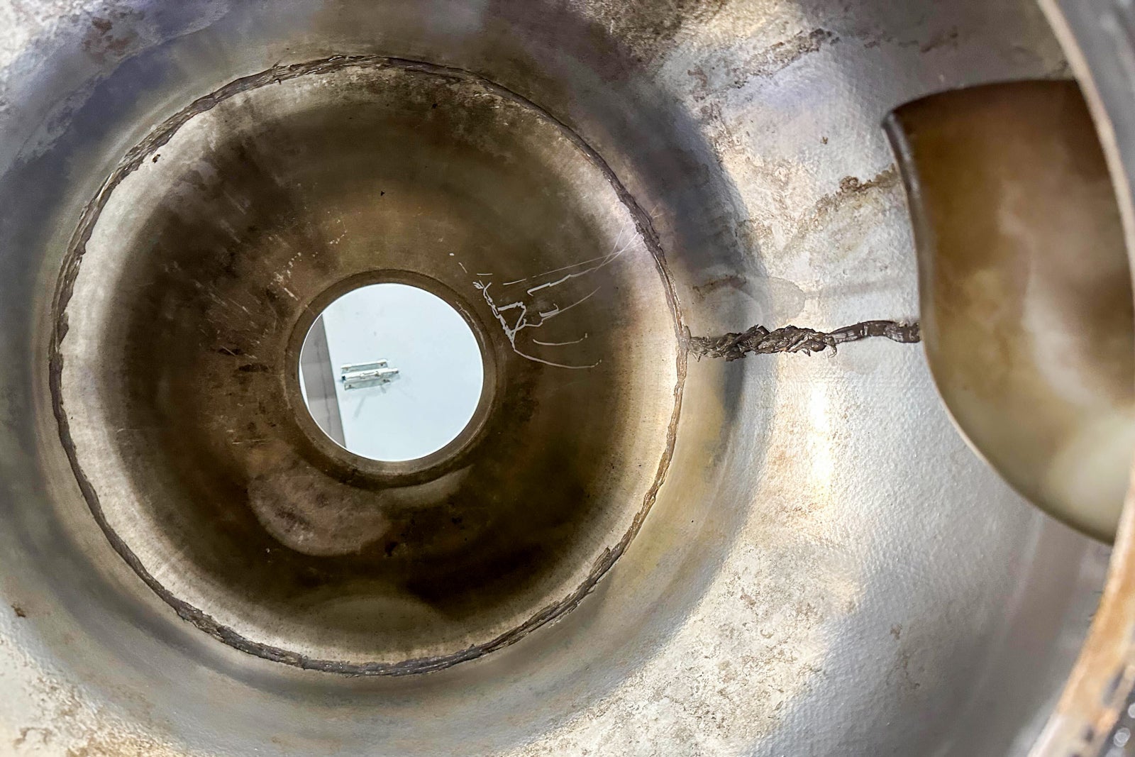 Once the technician documented the damage, the next step was determining what parts needed reinforcement. One piece of metal in the galley suffered from corrosion, so the technician sanded the area and recorded its remaining structural thickness.