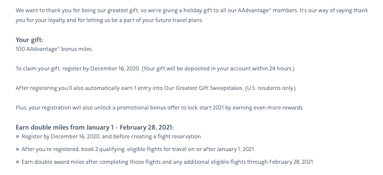 Well, there's also the chance to earn double miles for two months in early 2021 ... when the majority of people who have chosen not to fly will continue to stay grounded. Surely, this nugget of coal was an outlier, since my wife doesn't have status with American and hasn't flown with the airline in almost a year.