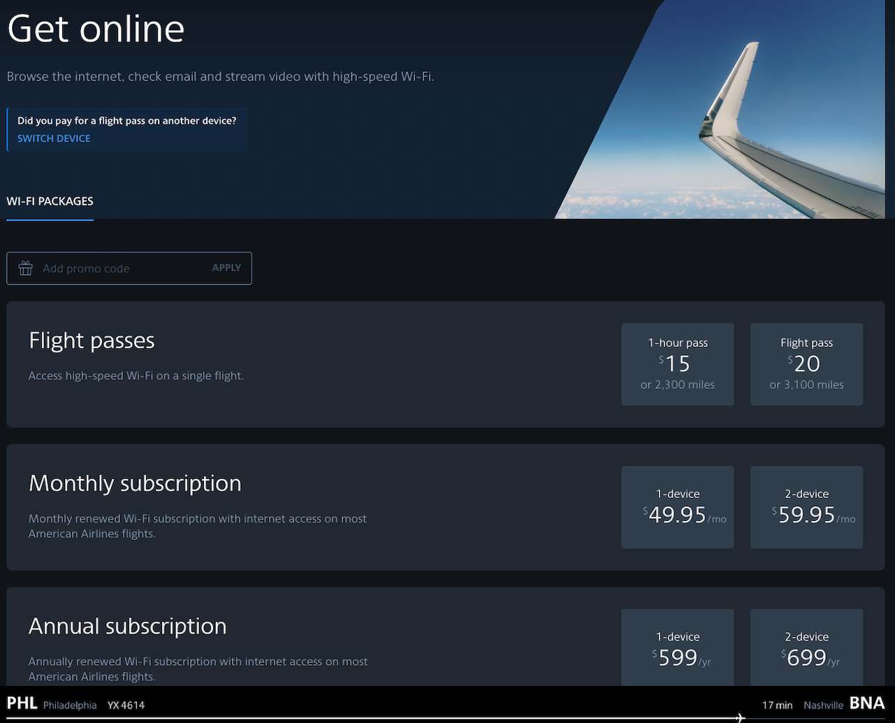 The first step was actually connecting to the internet. Though American has done a great job bringing faster and more reliable connectivity to the skies, its Wi-Fi pricing scheme is still one of the most expensive in the domestic skies. A flight pass for my short hop to Nashville was $20 or 3,100 miles. On Delta Air Lines, it would have been free, and on United Airlines, it would have cost $8. (Maybe one day American will also introduce free Wi-Fi, but right now, the carrier is only testing such a concept.)