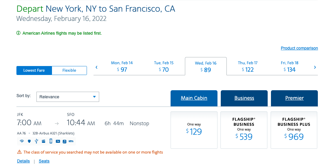 It also didn't take long for American Airlines to remove all references to the "Flagship Business Plus" product and restore its "Flagship First" fares on premium transcon flights operated by the carrier's swanky Airbus A321T.