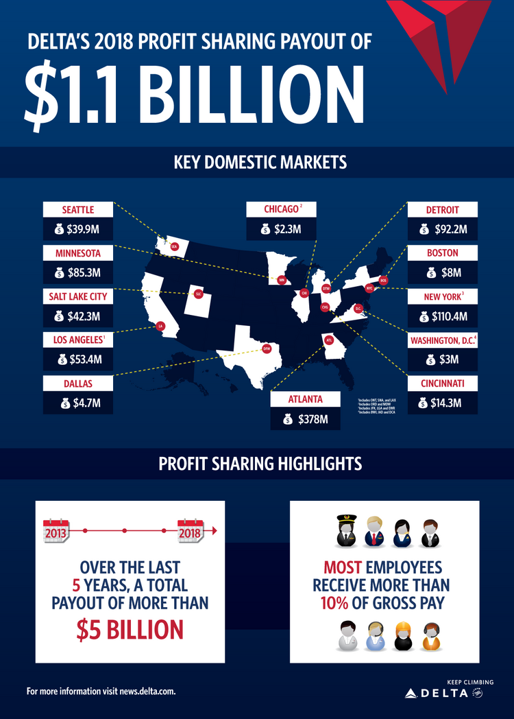Delta says it has paid out over $5 billion through the profit-sharing program over the last five years, and the average Delta employee will receive around $6,000 as a bonus for 2017. That's more than 10% of average base pay for most employees. These bonuses exist despite the fact that Delta's made quite a bit less net profit last year than the year before: about 18 percent less, with $3.6 billion in net income in 2017, compared to $4.4 billion.