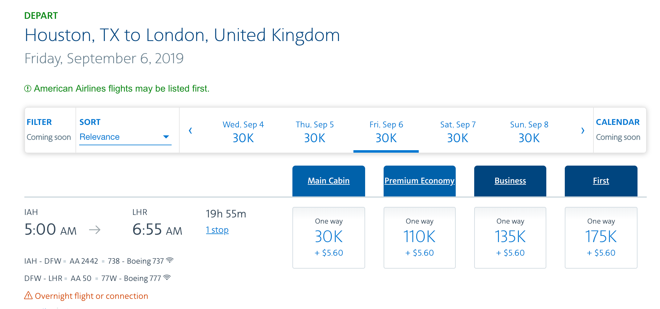 Let me be clear: As of today, American Airlines is still using saver award pricing based on its published award chart. There are still 12,500-mile economy saver awards, 25,000-mile first class domestic awards, 57,500-mile saver business class awards to Europe, etc. But here's the thing: Some routes on the new calendar simply don't seem to show what we know to be a saver award. We checked months of availability from Houston (IAH) to London Heathrow (LHR), which solely displays results on the new calendar and there was not one single day of anywhere near 57,500-mile business class pricing on American-operated flights — even in the dead of winter.