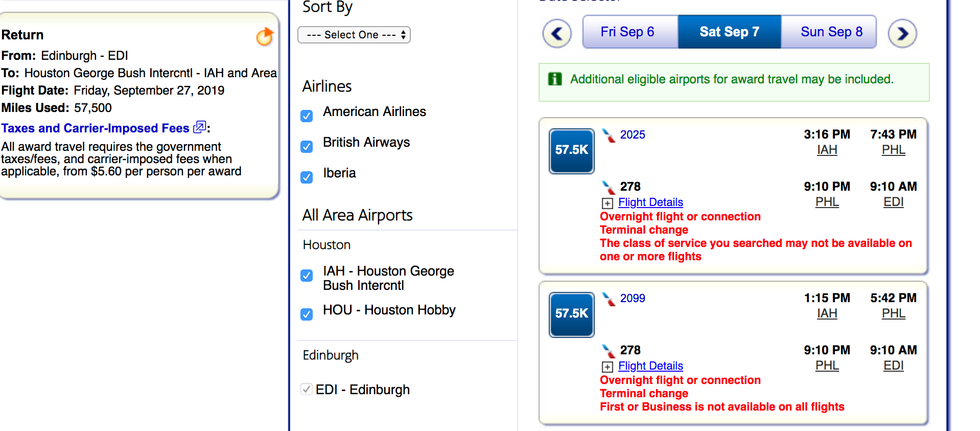 However, Houston – Edinburgh (connecting via Philadelphia) displays results on the old calendar and still has 57,500-mile saver business class awards on certain dates.