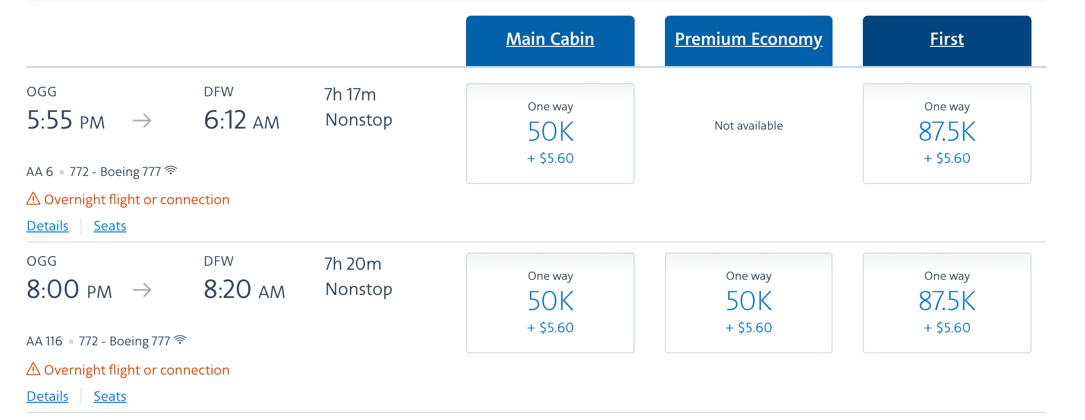 You aren't going to know that if you don't click on each option individually to check. Further complicating things is that if your city is on the monthly Reduced Mileage Awards List and you have an eligible American Airlines cobranded credit card, you will pay even less than 12,500 miles — potentially as little as 6,500 miles each way (less for flights under 500 miles). However, these discounts won't appear online, so you need to call to book.