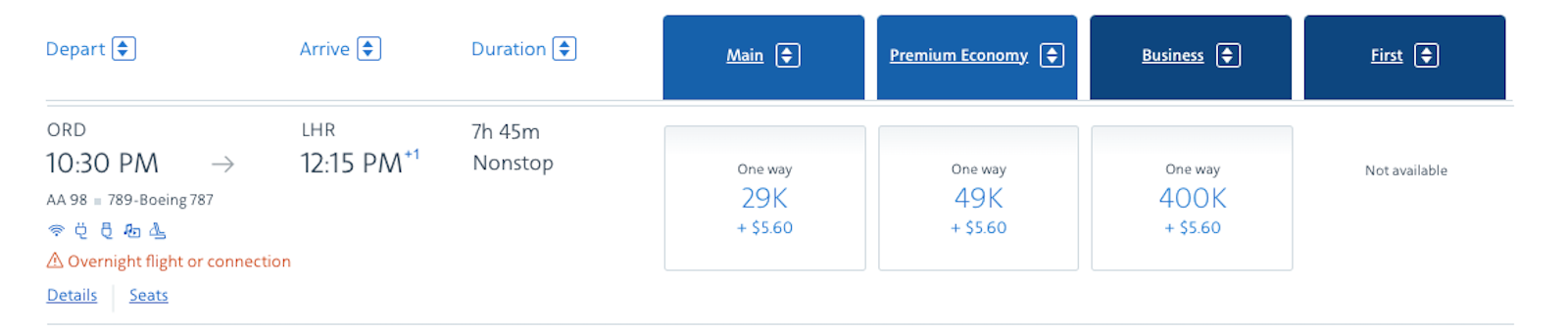 Economy redemptions start at 29,000 AAdvantage miles, with premium economy at 49,000. At the time of this writing, you'd have to redeem a whopping 400,000 miles to snag a business-class seat.