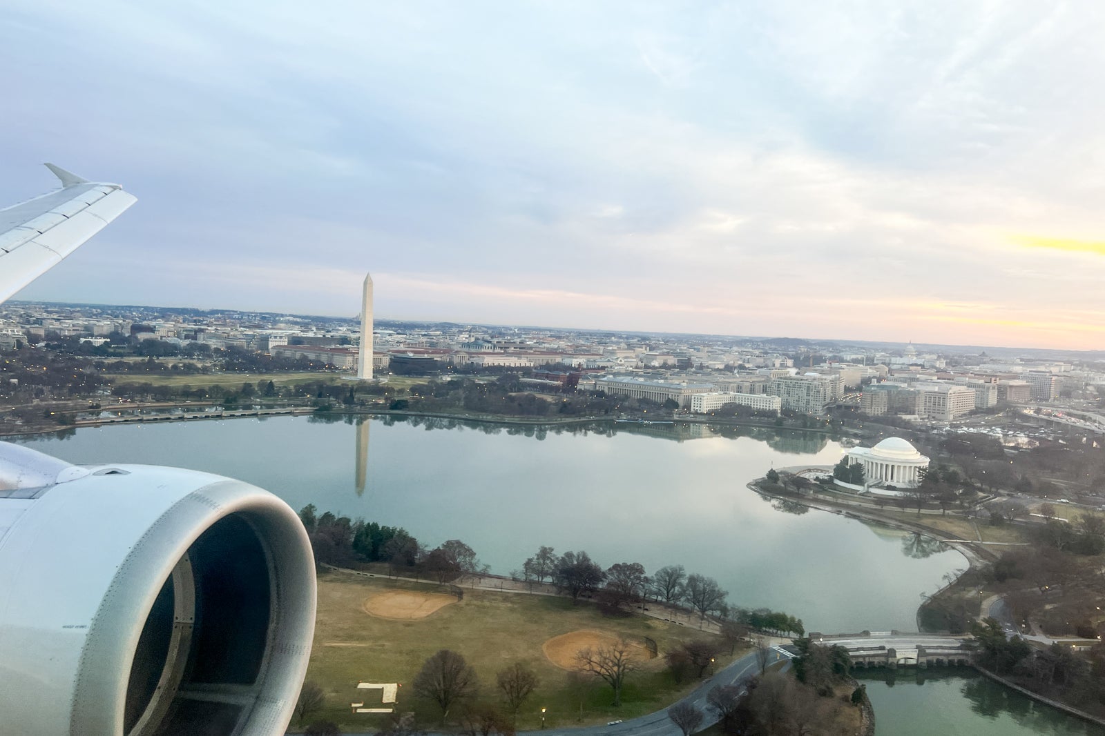 During the flight to Washington, I watched the sun rise over the Eastern Seaboard. Then, my Airbus coasted over the Potomac River for one of my favorite landings in America, passing all of the capital's monuments. At 7:14 a.m., my plane was at the gate, the door opened and I started my extremely brief layover in Washington.