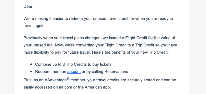 Eligible travelers should check their email for a note from American with the subject line "Update to Your Travel Credit." The email contains details about the conversion process, as well as your new credit information.