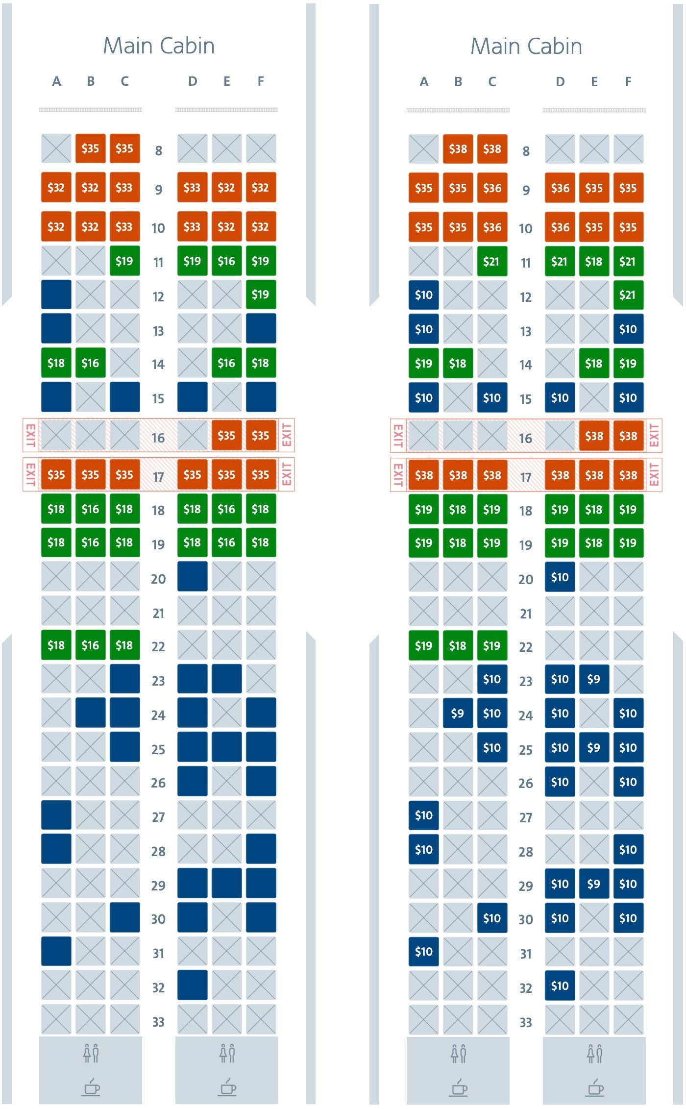 Left: seat pricing on regular economy ticket; Right: seat pricing on basic economy ticket