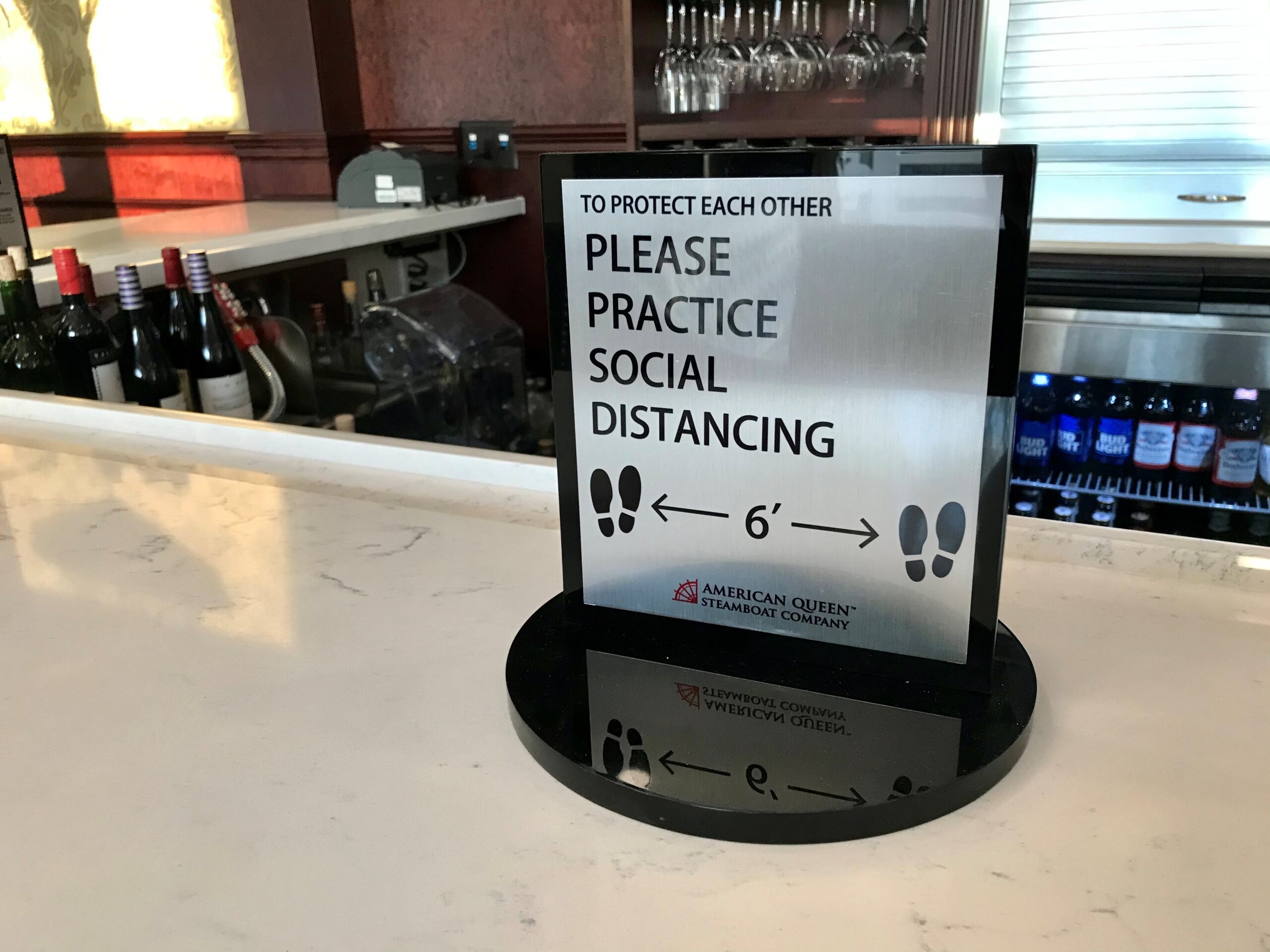 In addition, to encourage social distancing, some seating in places like the ship's theater are blocked off. Signs asking passengers to stay distanced and sanitize their hands are widespread.