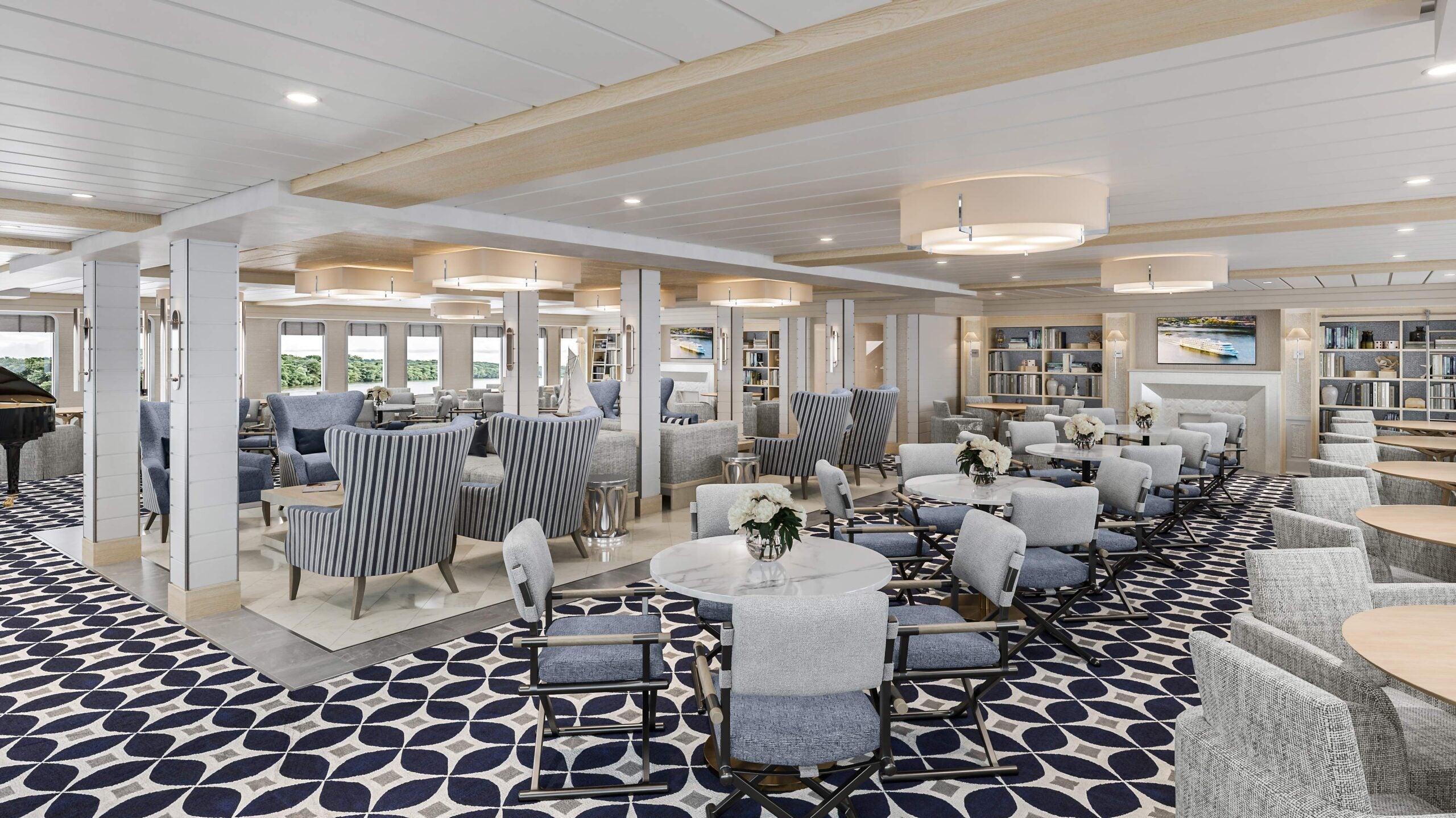 The vessels also will have observation and sitting areas at their bows, both inside and out, and an expansive forward lounge with 270 degree views. Other public spaces will include two dining venues, with all of the interiors featuring modern decor created by Miami design firm Studio DADO.