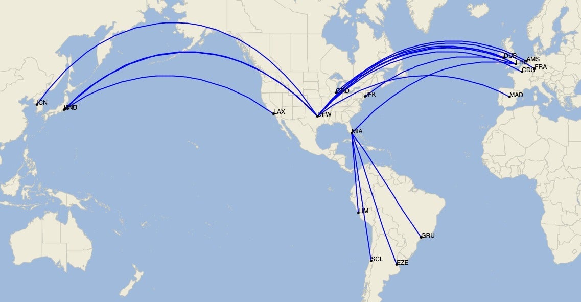 - Miami (MIA) – Buenos Aires, Lima (LIM), London Heathrow, Santiago (SCL), São Paulo Guarulhos (GRU)