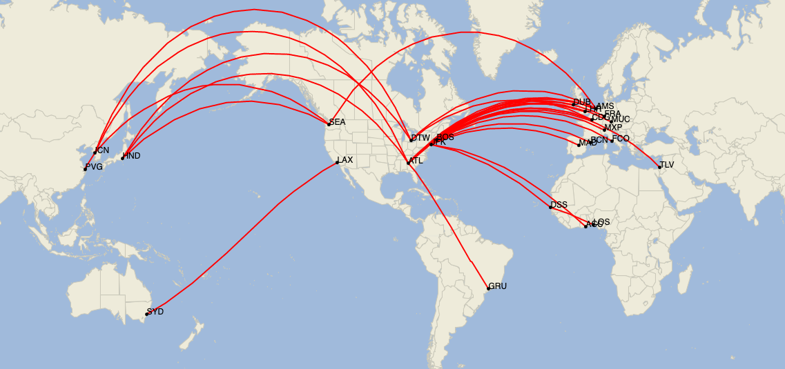 - Atlanta (ATL) – Amsterdam, Dublin, Frankfurt, London Heathrow, Munich (MUC), Paris Charles de Gaulle, São Paulo Guarulhos, Seoul Incheon and Tokyo Haneda