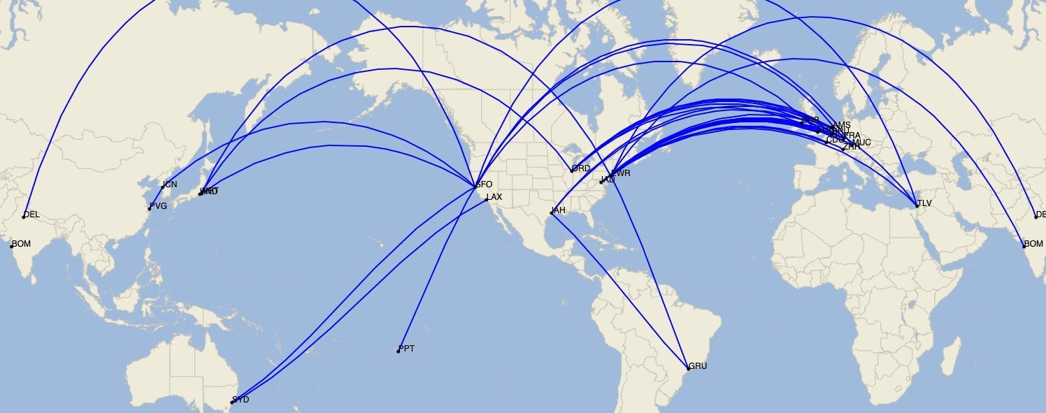 - San Francisco (SFO) – Delhi, Frankfurt, London Heathrow, Munich, Seoul Incheon, Shanghai Pudong via Seoul, Sydney, Tahiti (PPT), Tel Aviv and Tokyo Narita