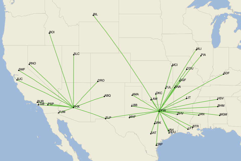 Historically, Mesa has operated flights on behalf of American Eagle (the carrier's regional brand ) out of American's Dallas/Fort Worth and Phoenix hubs. These flights included short puddle jumpers to places like El Paso, Texas, and Lawton, Oklahoma.