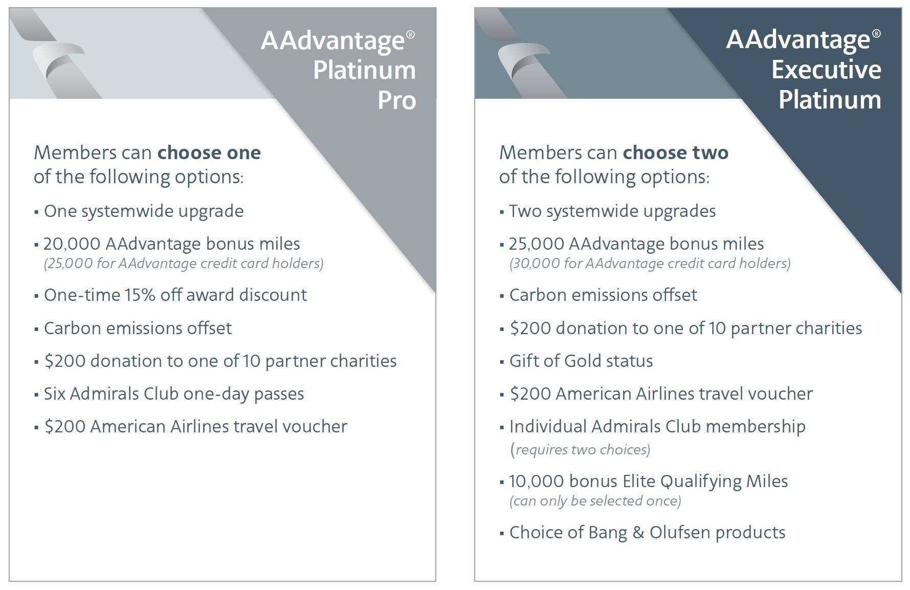 Both Platinum Pro and Executive Platinum members have a choice of receiving a lump sum of AAdvantage miles when qualifying for status.
