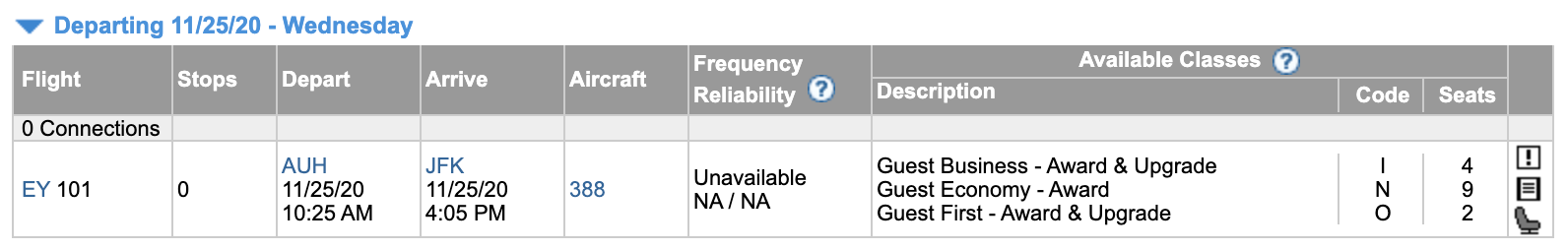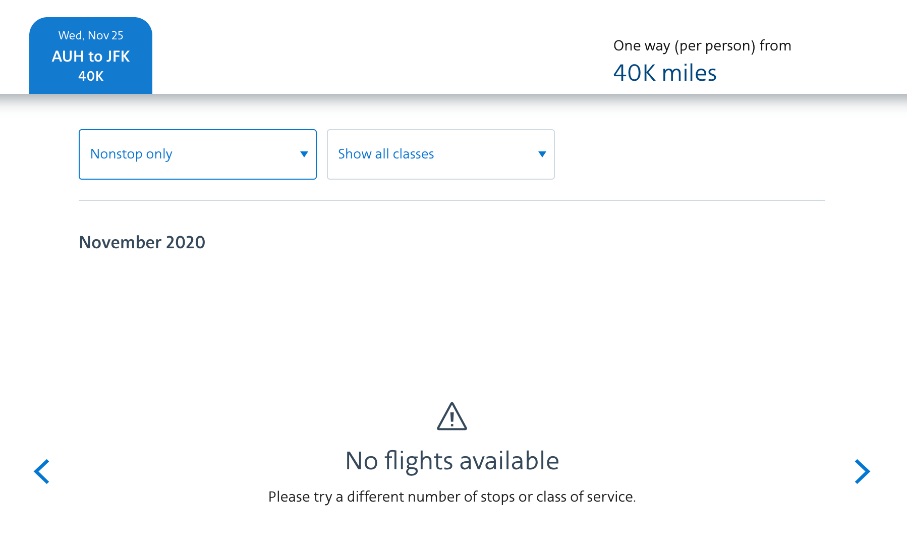 Unfortunately, it's worth noting that Etihad awards are no longer appearing on AA.com, a functionality that was added less than a year ago. Sure enough, here are the search results from ExpertFlyer (which is owned by TPG's parent company, Red Ventures) for a flight from Abu Dhabi (AUH) to New York-JFK in November: