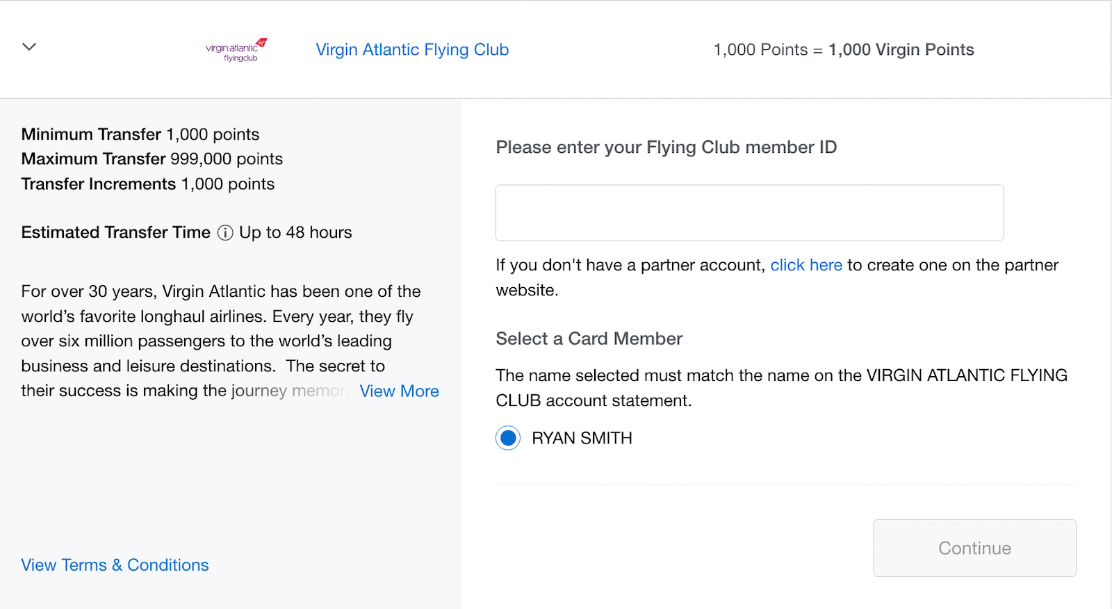 If you're using a transfer partner for the first time, everything is in one place. Here's an example for Virgin Atlantic Flying Club, since I've never transferred points to this program. You can add your loyalty account number and read some information about that program in one place, which you'll see after you click on the name of the program in the table.