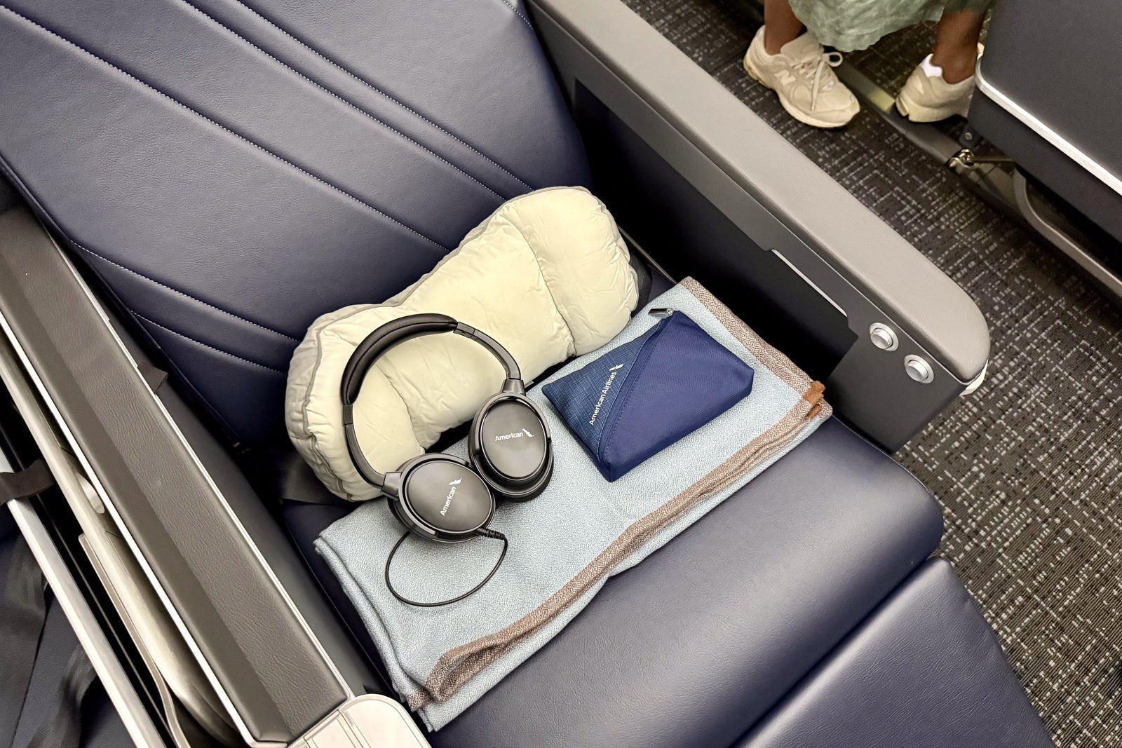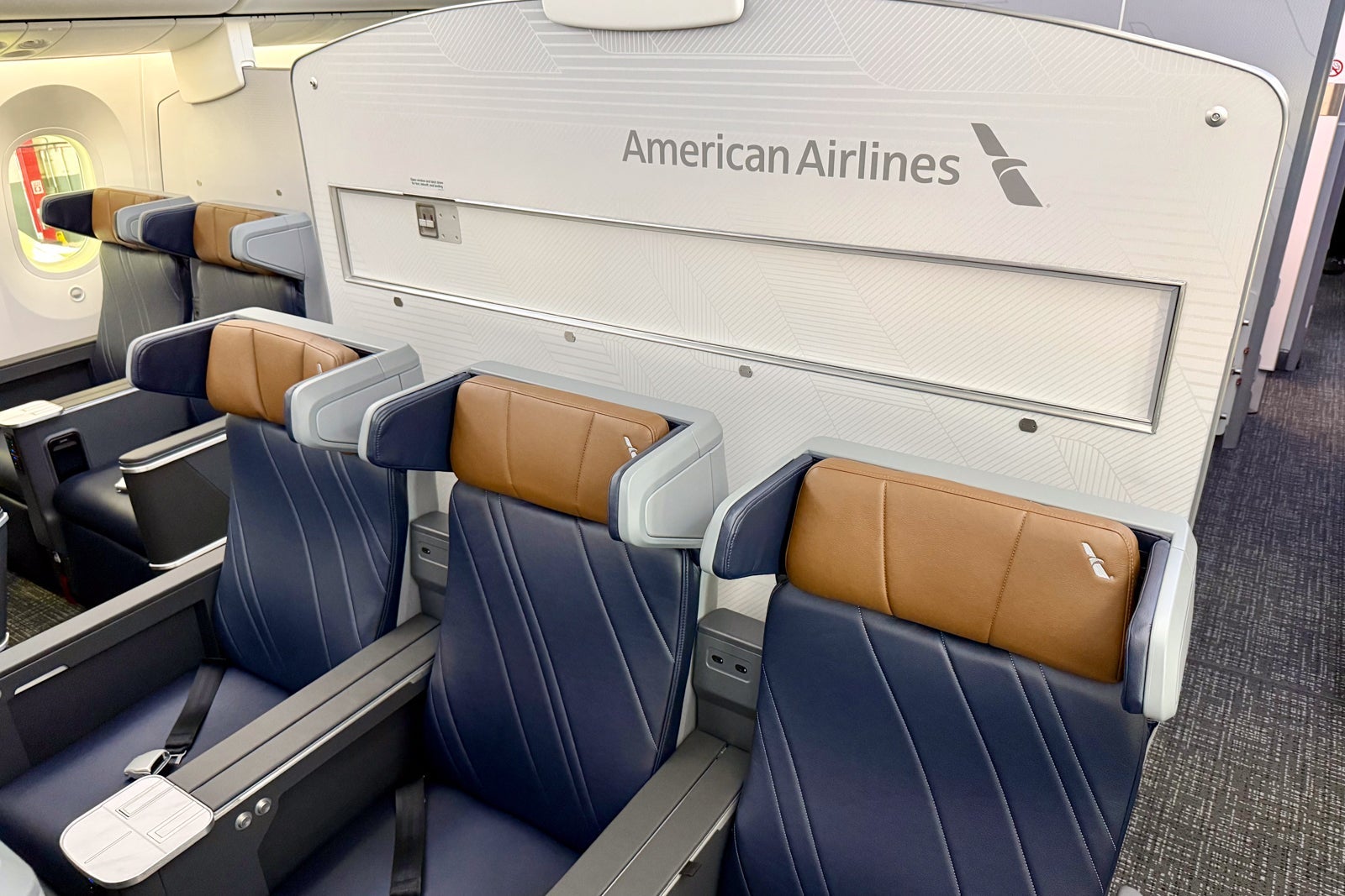 American infused the same cabin design from its Flagship Suite into the new premium economy section, which certainly elevates the feel of the premium economy experience. For instance, the tan headrest covers with the flight symbol logo contrasted with the deep blue seat covers with intricate stitching promote a luxe vibe for this cabin, something that's sorely needed relative to American's existing sterile premium economy experience.