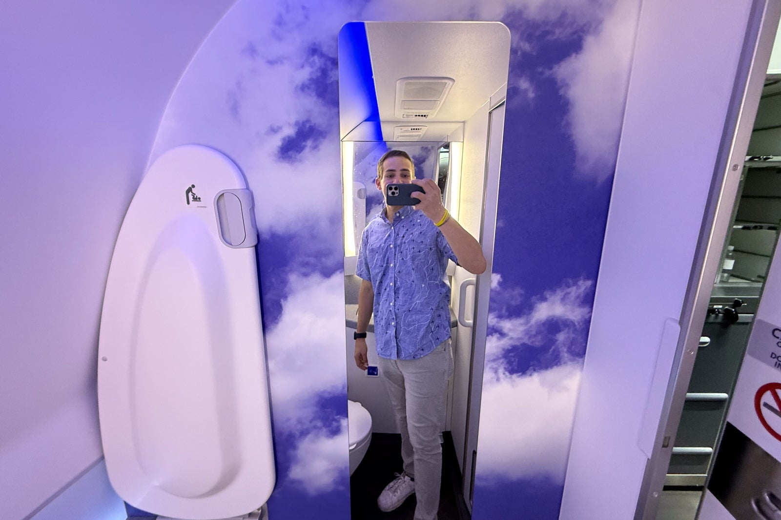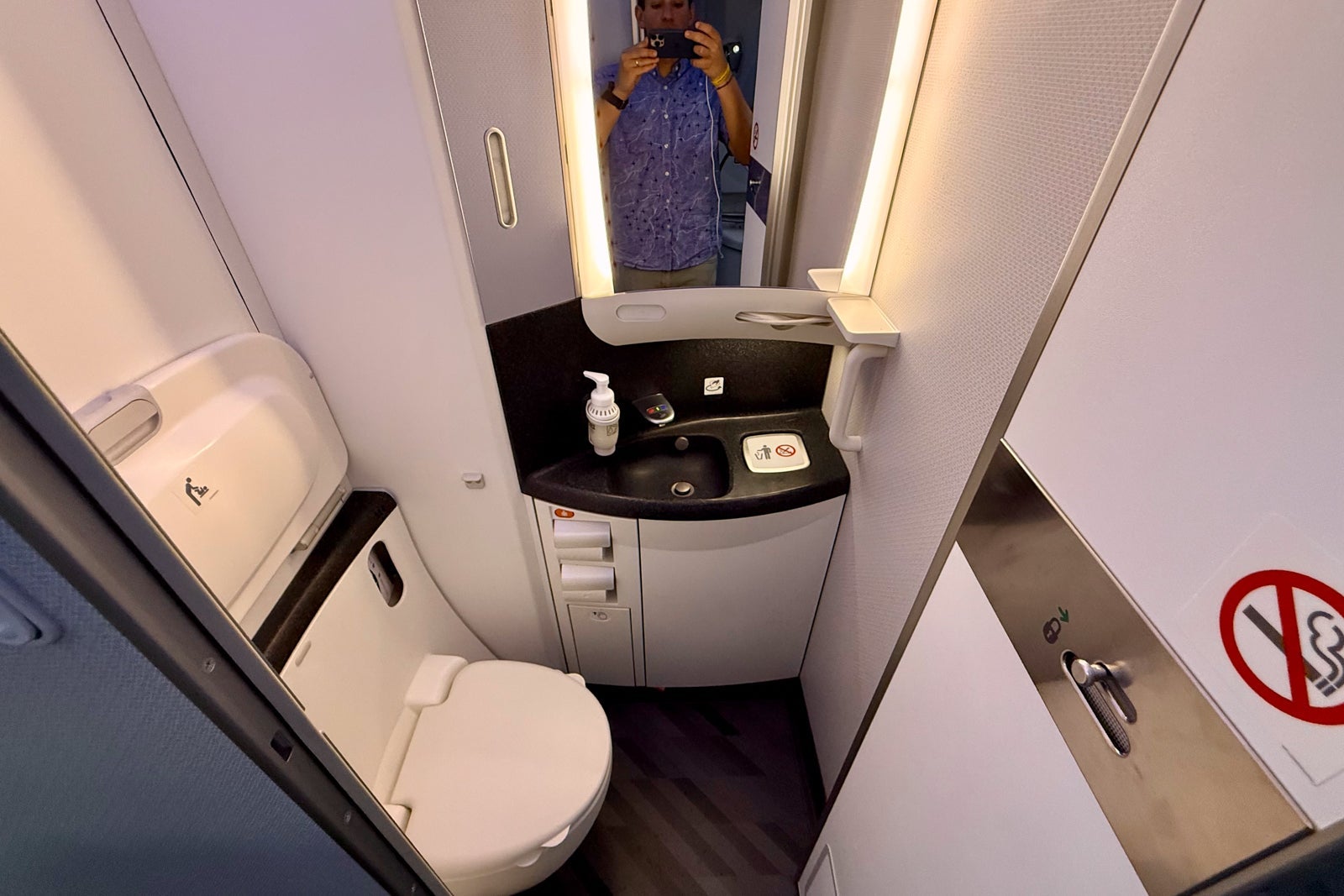 There are three lavatories available for business-class travelers, all of which have an interesting cloud wallpaper that I haven't seen before on an American jet.