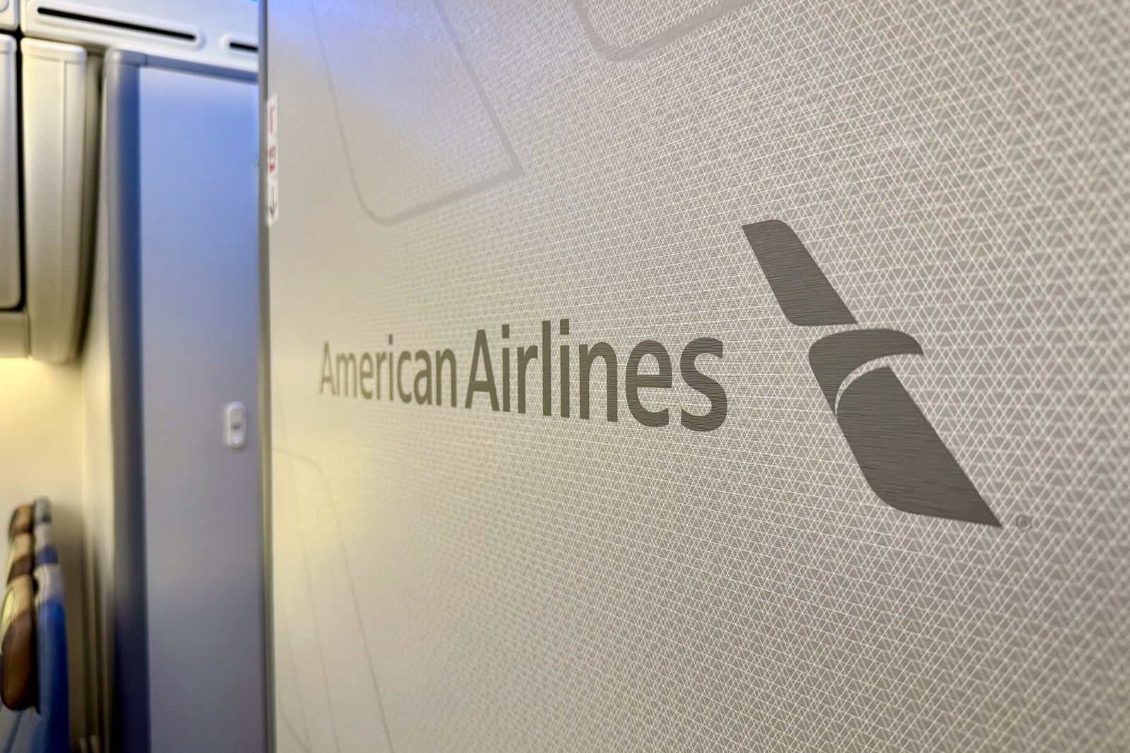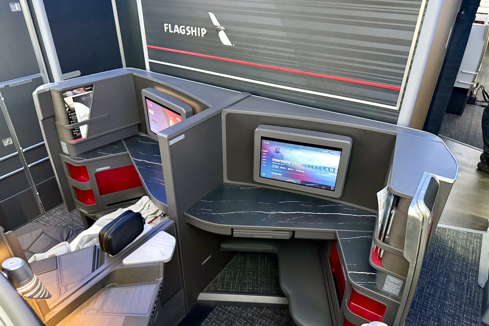 Already from this moment, it's pretty clear that this plane is unlike any other. Whether it's the faux wood-lined doors or the black Flagship backdrop on the bulkhead wall, this cabin just feels more premium than anything American has offered before.