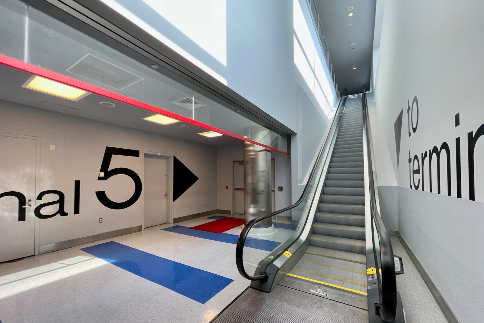 Once verified, you're instructed to descend down the escalator and wait for the next bus. For now, they run every 15 minutes, though that'll drop to ten minutes as flight schedules increase.
