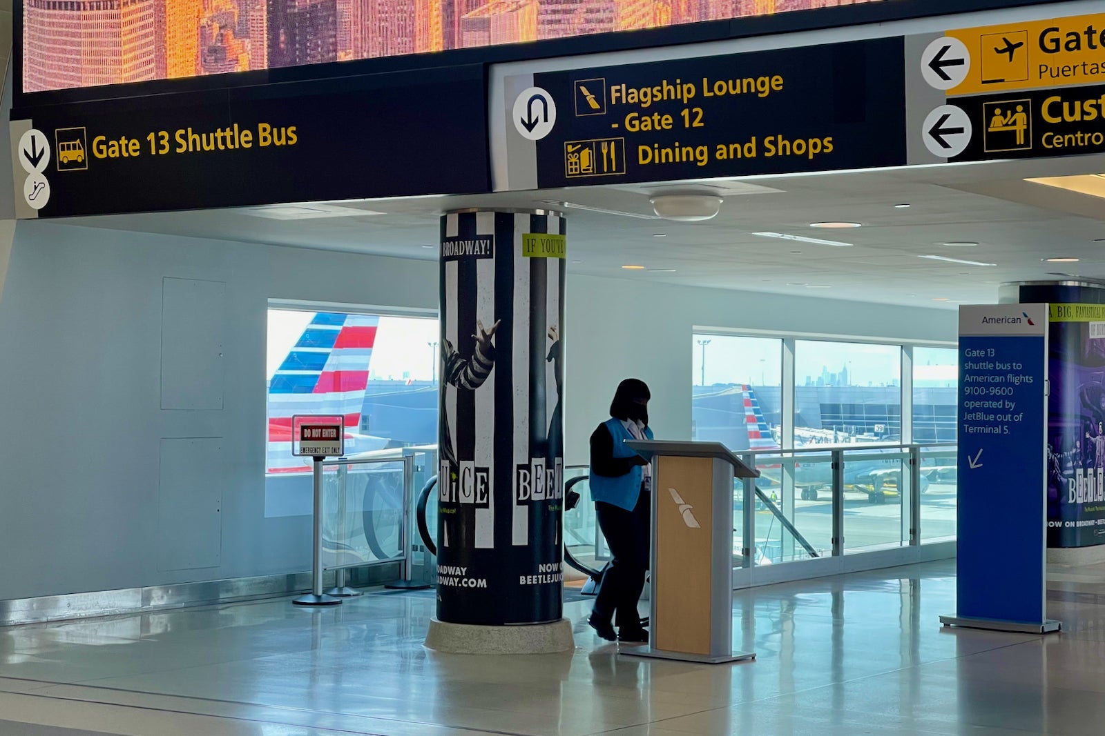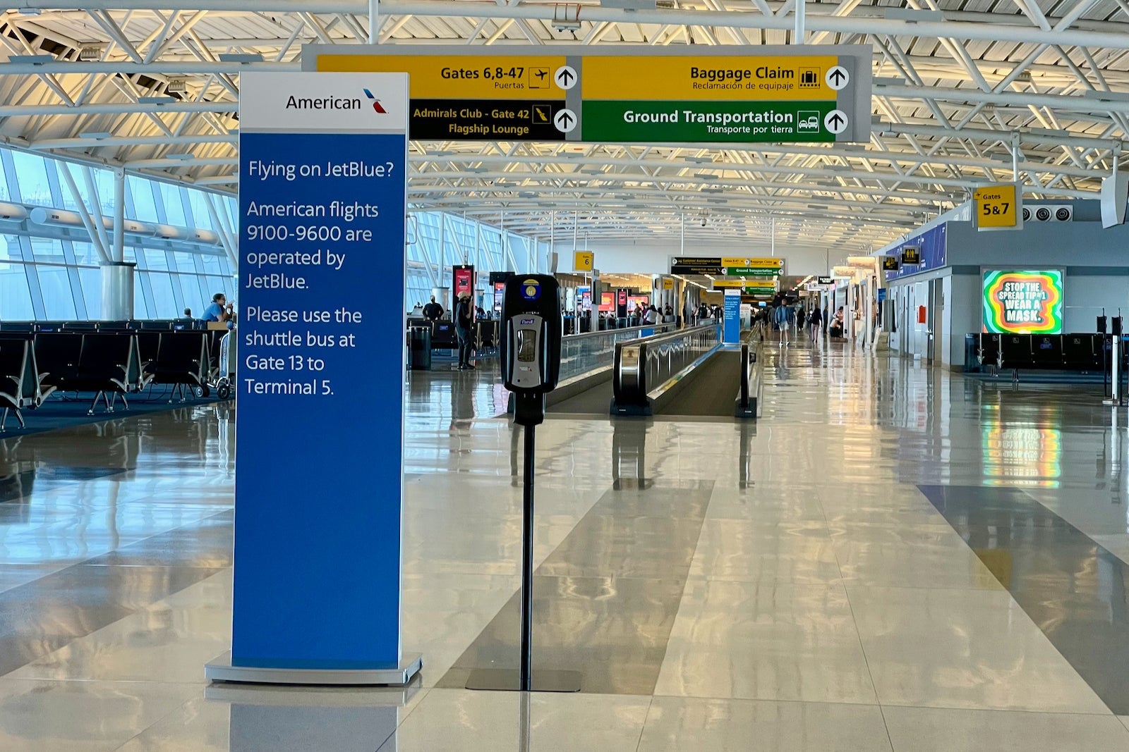 When I arrived at Terminal 8, I immediately saw plenty of signs directing passengers booked on a JetBlue codeshare flight — indicated by an AA flight number between 9100 and 9600 — to head to Gate 13 to catch the bus to Terminal 5.