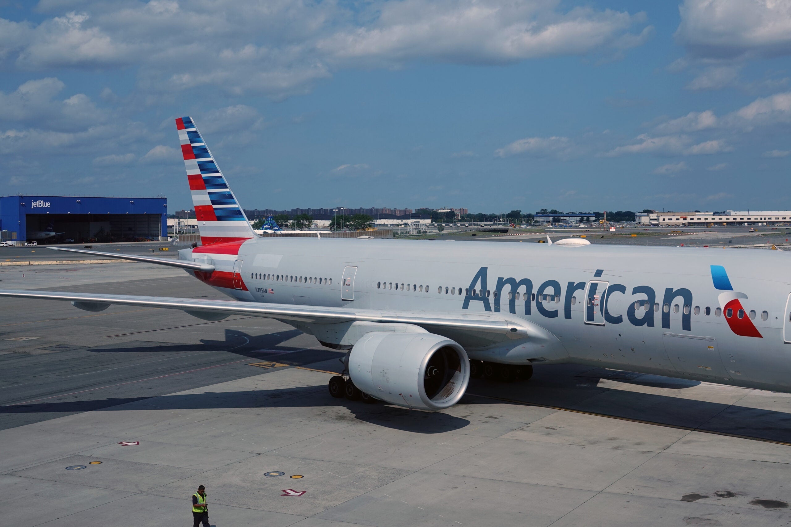 We didn't wait long to depart. As we pulled out, I caught a glimpse of some American Boeing 777s, before we drove towards Terminal 7, passing by AA's transatlantic partner, British Airways, and finally arriving at the home of its newest partner, JetBlue.