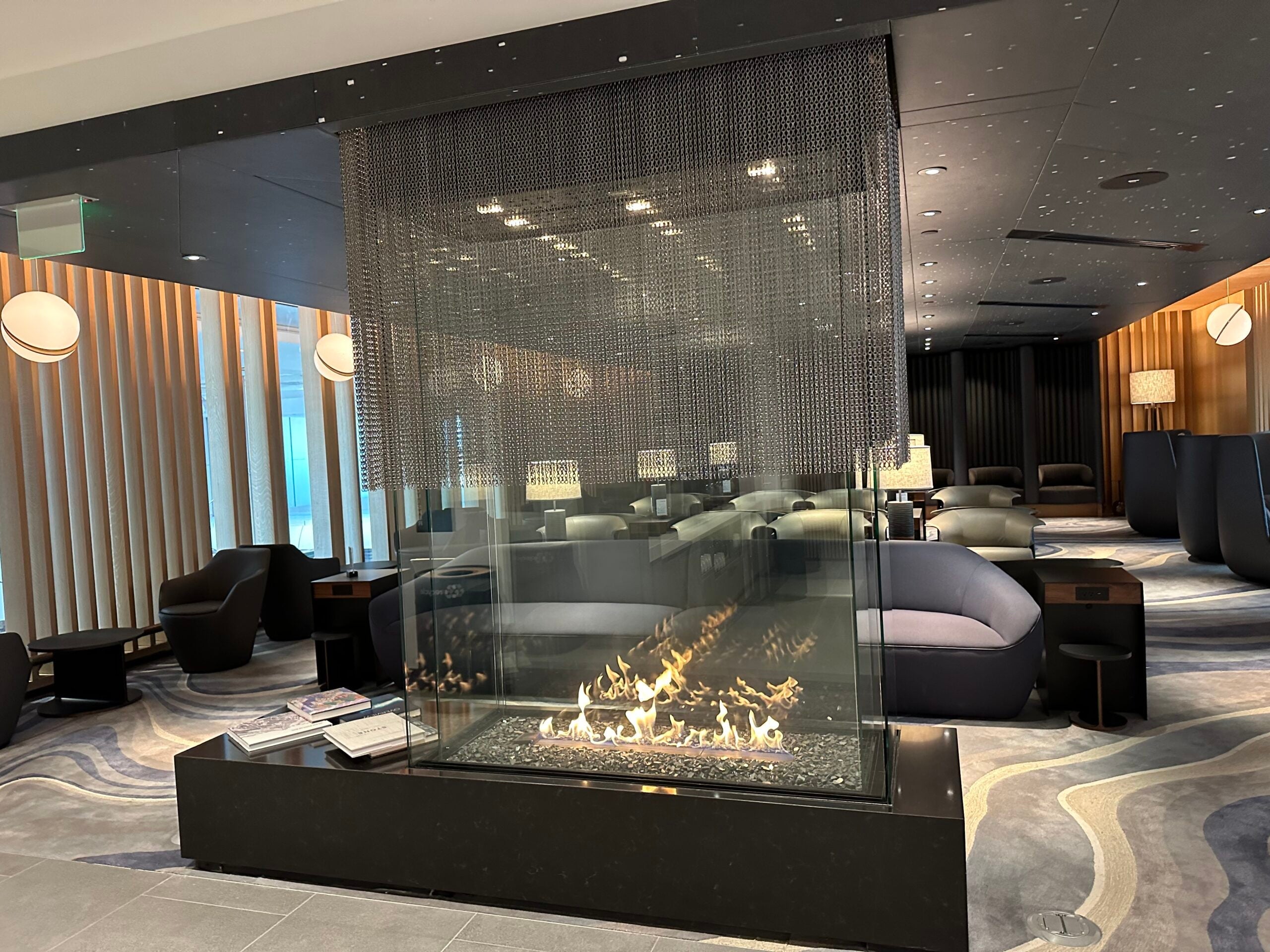 American continued the same fireplace motif in Denver, giving the space a cozier and homier ambience.