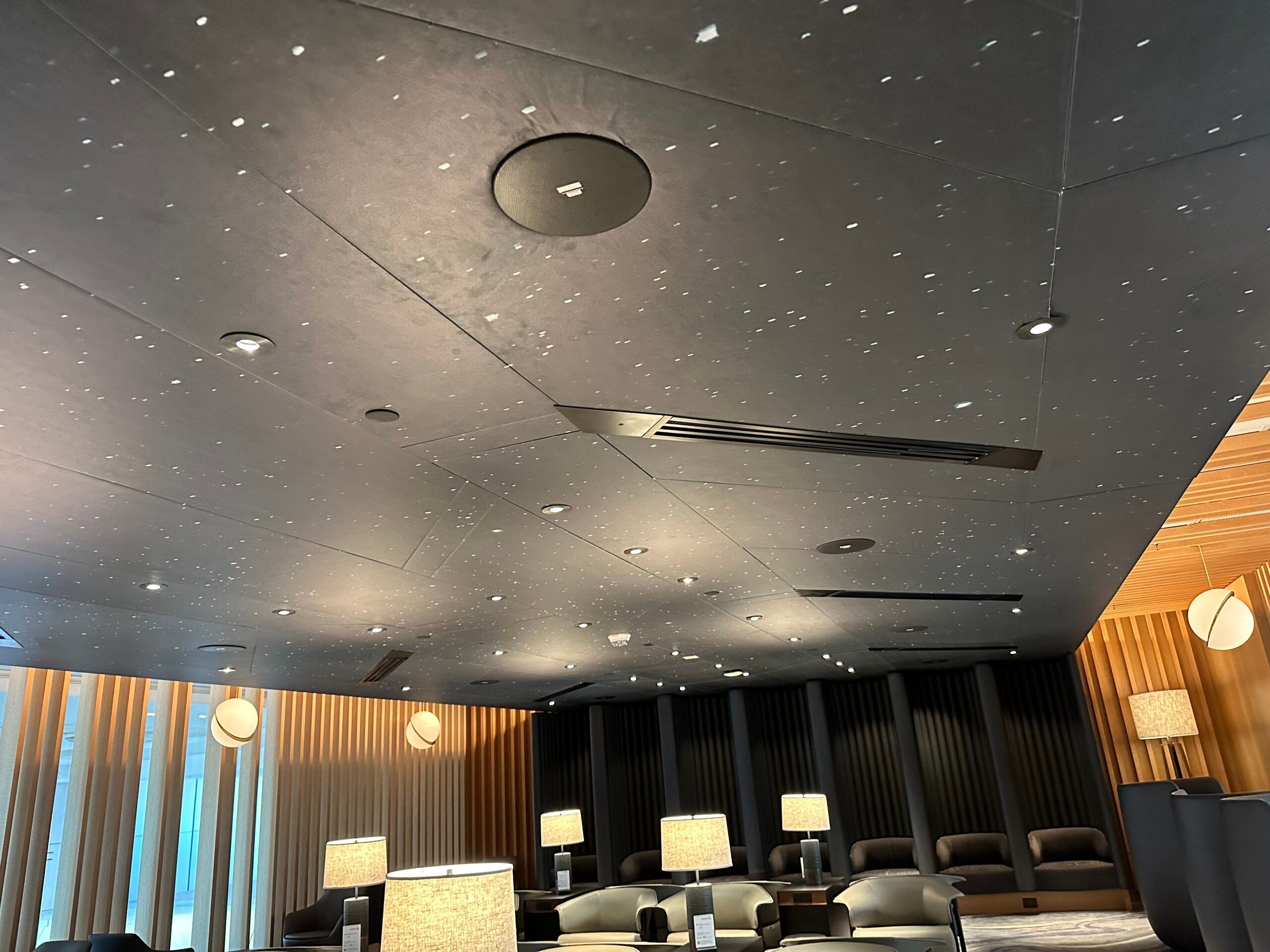The lounge also contains a few local homages to Denver and Colorado. For example, the ceiling of the living room pavilion is painted black with stars dotting the area, resembling a starry night sky.