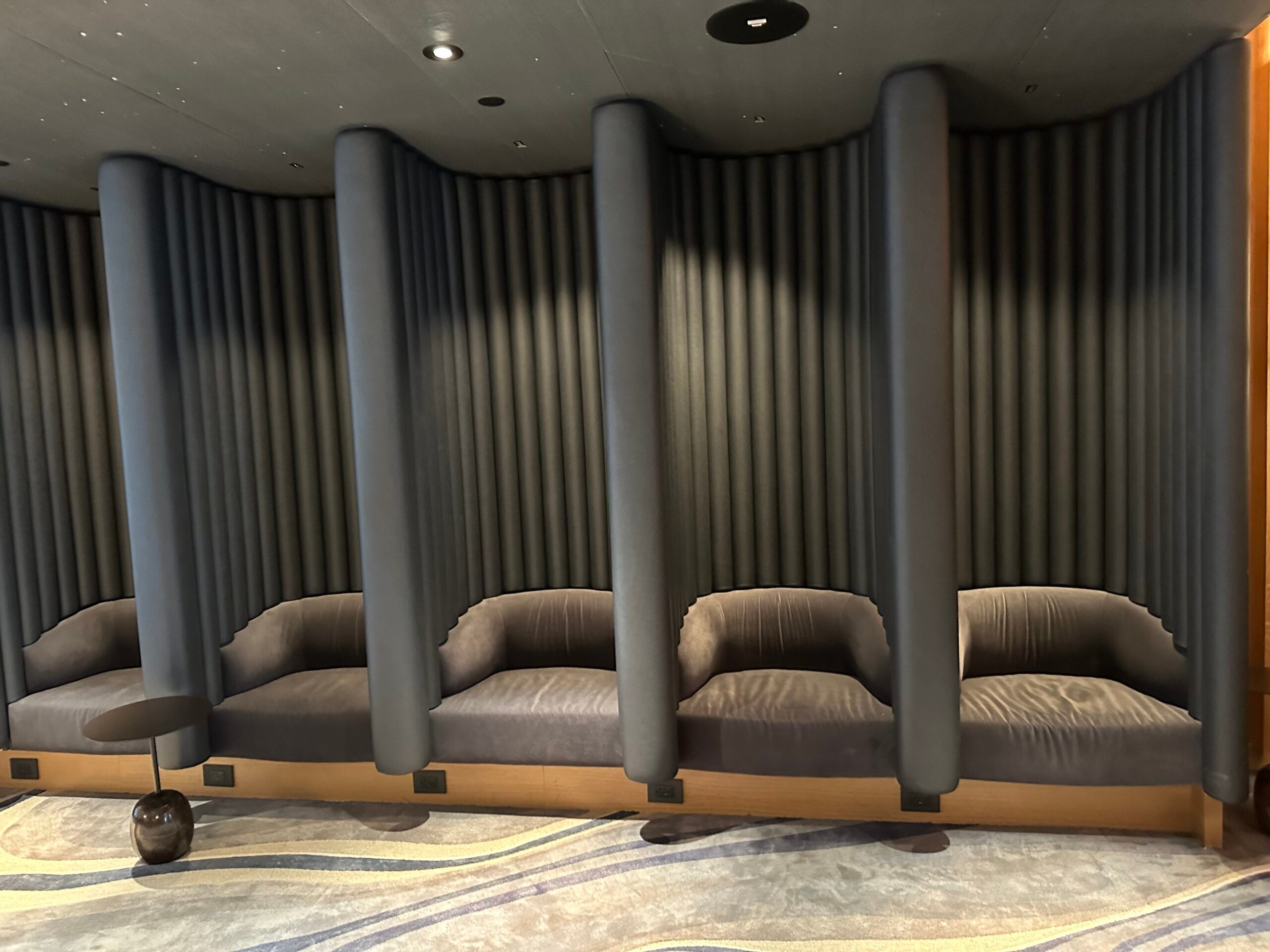 There is a set of seats at the back of the living room area with partial dividers, but they don't afford much privacy. The dining area also has booths, which allow for some seclusion, but most of the seating within the lounge is open.
