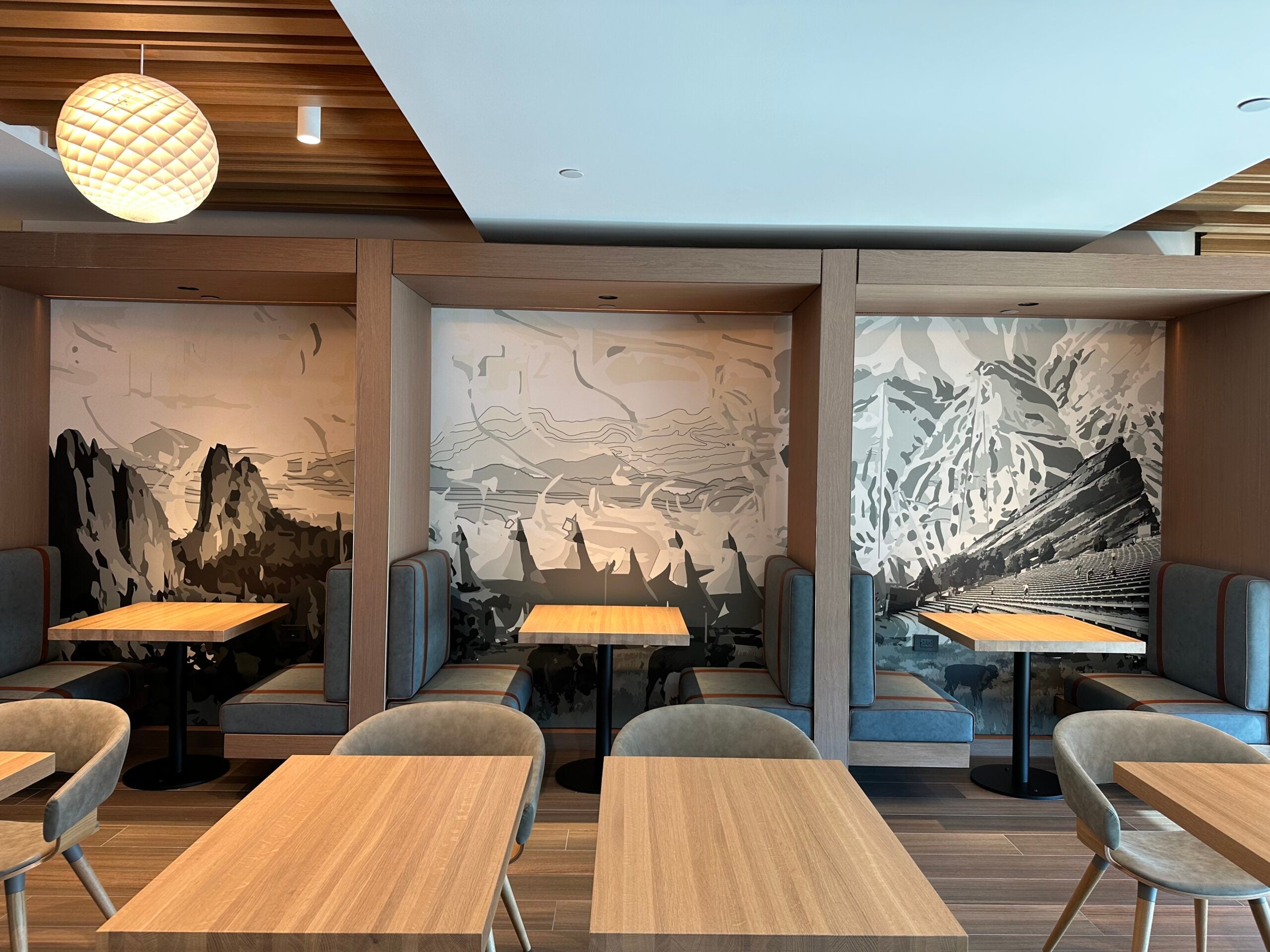 Art of the Rocky Mountains and the Eastern Plains hang in the dining area. From there, guests have a clear view of the airfield to see planes take off while grabbing a quick bite.