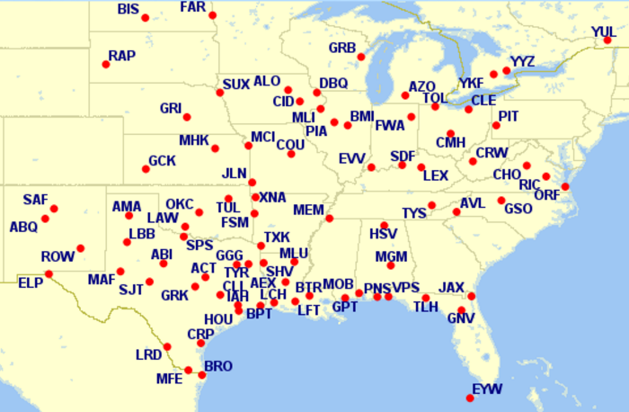 May's list is shorter, but still includes 53 airports. Not mapped (for space): Palm Springs (PSP), Reno (RNO), Calgary (YYC) and Edmonton (YEG).