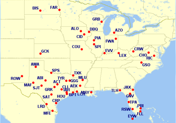 - Gulf Coast: Mobile, AL (MOB), Pensacola, FL (PNS), Valparaiso/Destin, FL (VPS), Gulfport, MS (GPT)