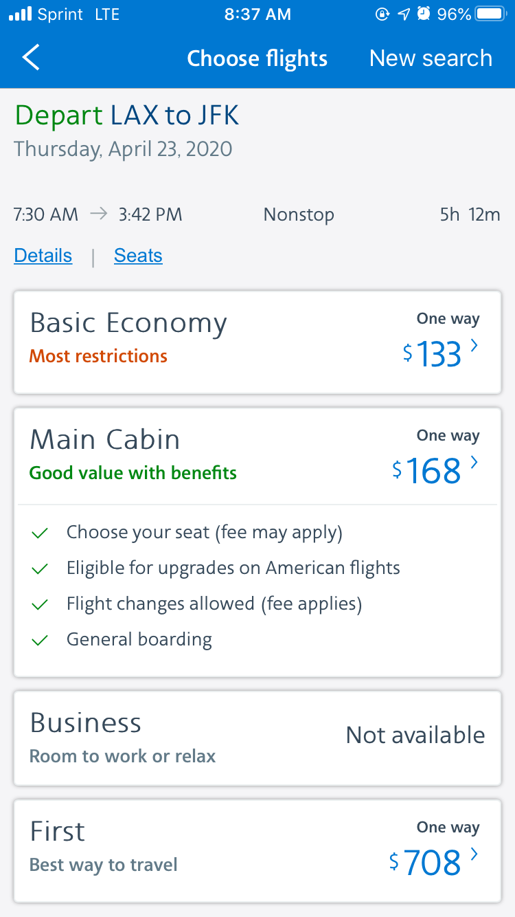 But that's not all. As TPG's Benji Stawski discovered, American is selling some of the flights as a two cabin flight on the LAX-JFK route. He discovered that first class is priced like business class and has a business fare code but still lists first-class perks like 3 free checked bags. You are also able to book American's premium economy as Main Cabin Extra, he discovered.