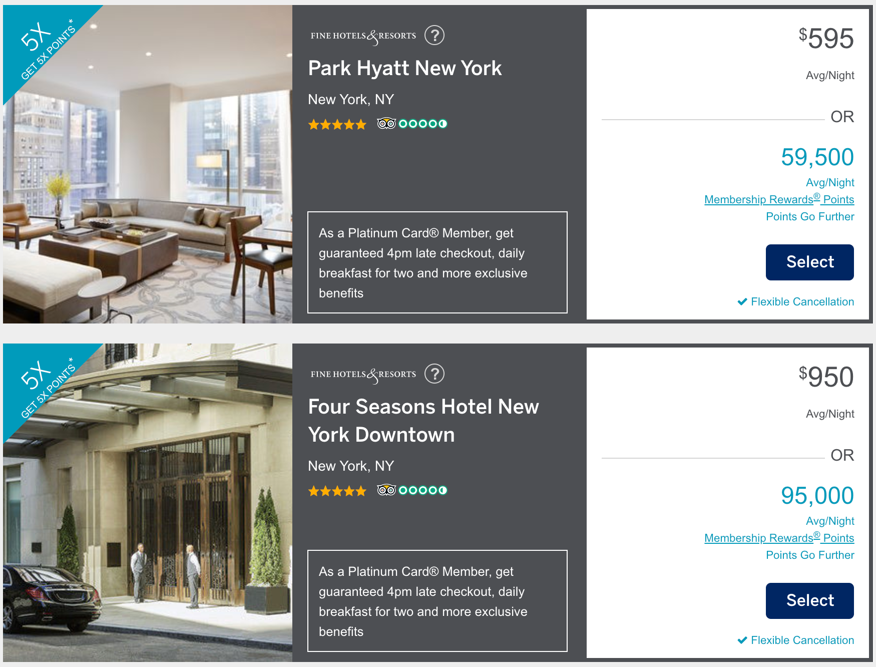 Although, the Park Hyatt New York and Four Seasons are already bookable online through Amex Travel, eligible for 5x points or Pay with Points: