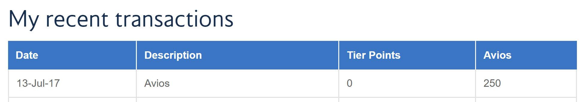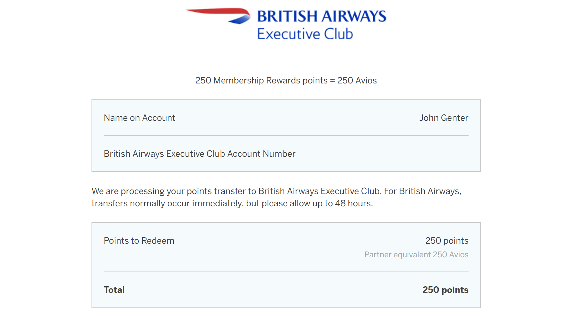 To confirm that a transfer wouldn't error out, I transferred the minimum number of 250 Membership Rewards to Avios:
