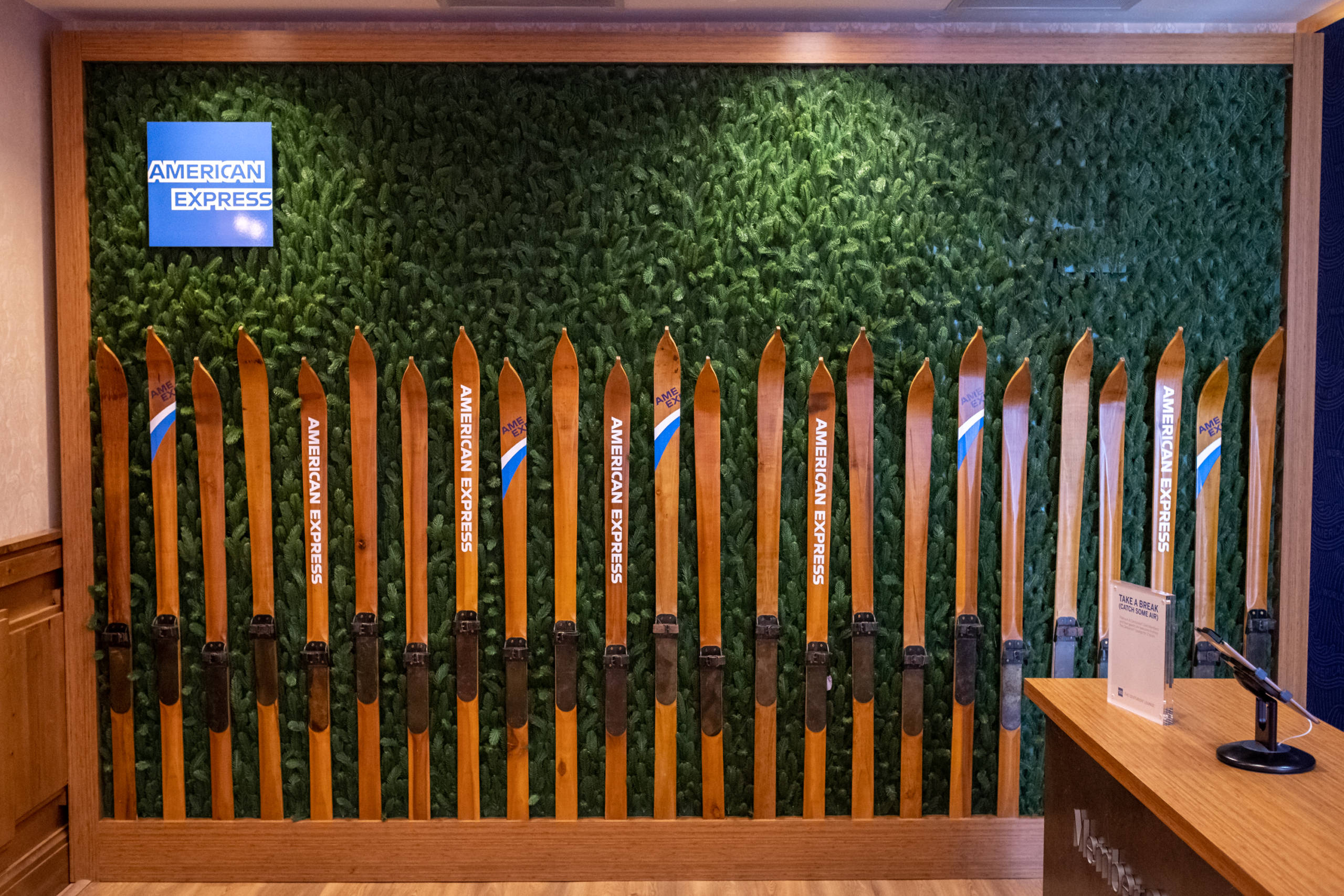 As you walk into the lounge, you'll see the recognizable American Express green wall -- but in a nod to its location, it is decorated with a row of branded wooden skis.