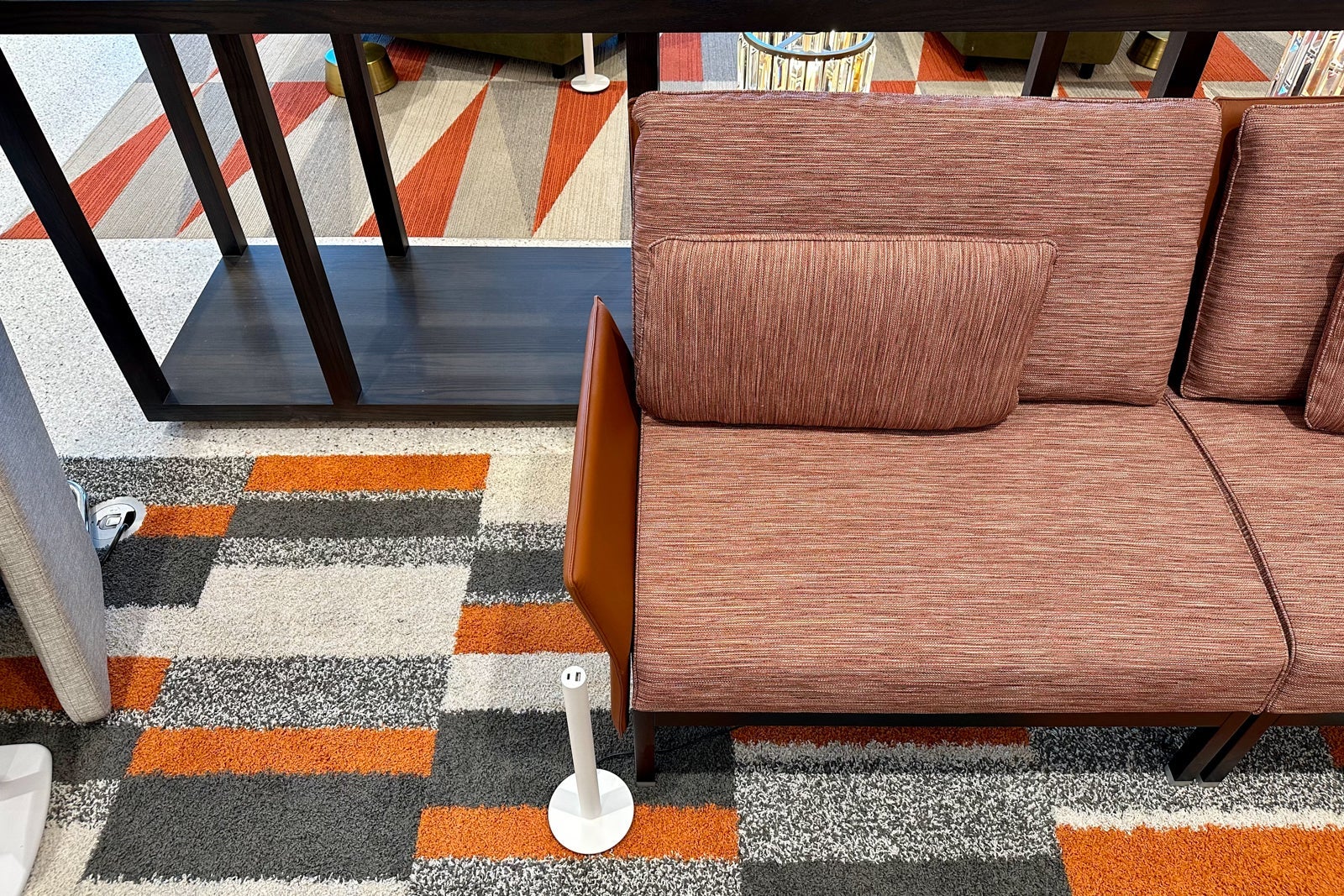 The main lounging area is located just behind the lobby, and it's split between three seating zones. There's a row of bench seating, a small room with couches and another room with individual chairs and a high-top coworking table.