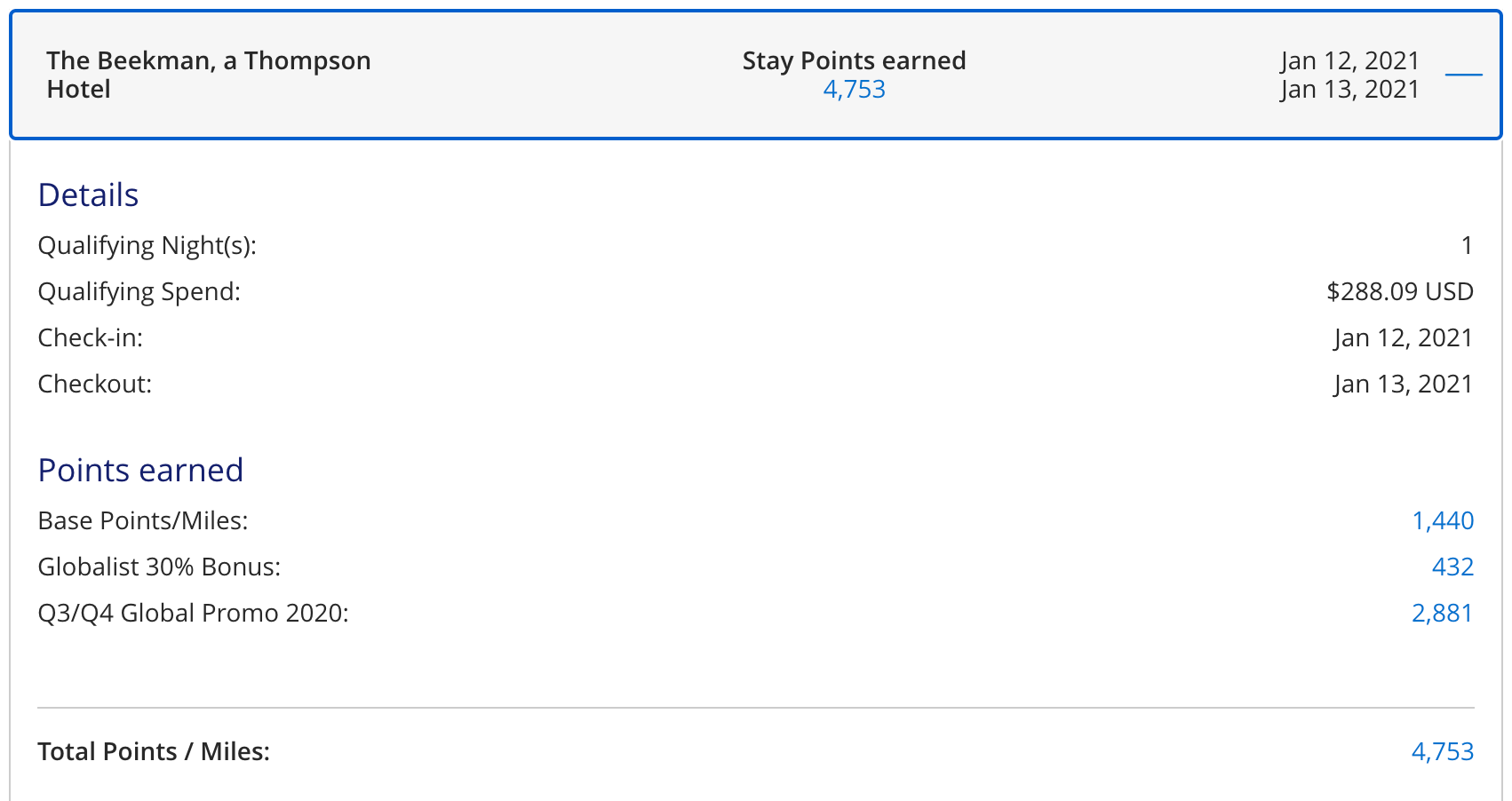 In the end, thanks to ongoing Hyatt promotions and my status, I earned 4,753 points for the stay, worth about $80. I also got one elite night credit — which will be doubled with a promotion — to help me on my quest to earn another year of Globalist status. I even earned 288 American Airlines miles (worth about $4) thanks to Hyatt's partnership with the airline.
