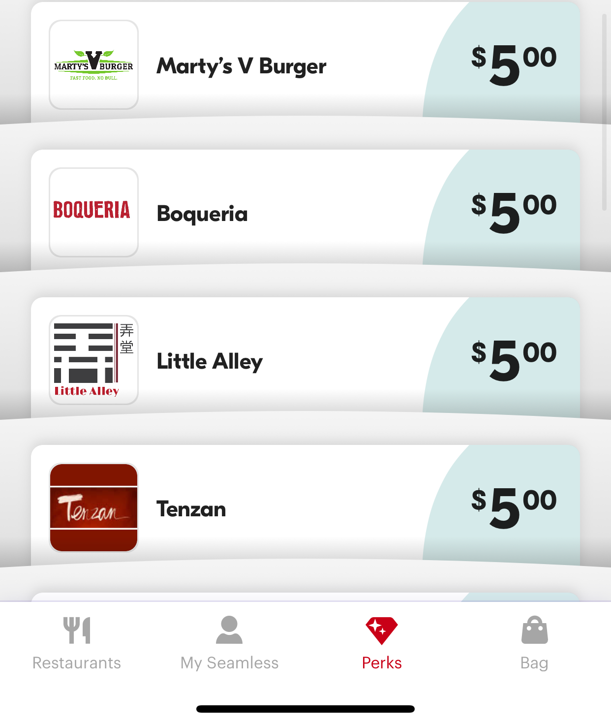 I don't find it difficult to find two "Perks" options per month that will satisfy a lunch craving for about $5. That's because many restaurants (at least in my neck of the woods) will offer a $5 first-timer discount with no minimum purchase, whether for pickup or delivery. Going for a walk to pick up is my preferred choice anyway, and saves on delivery fees.