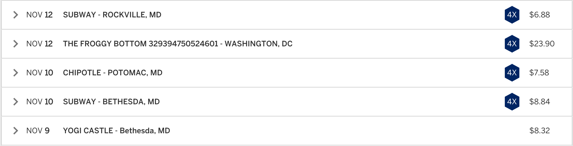 So what should you do? First of all, go through your statements and see if you have any missing bonus points. It's very easy to see which transactions earned bonus points directly through the Amex website. As you can see, I had a transaction in November at a frozen yogurt store (processed through Square) that didn't earn 4x points.