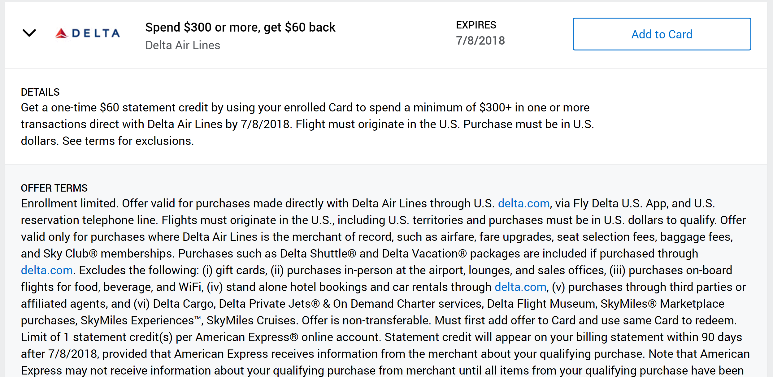 The latest offer is for Delta purchases, offering a $60 statement credit for spending $300 or more on "one or more transactions direct with Delta Air Lines:"