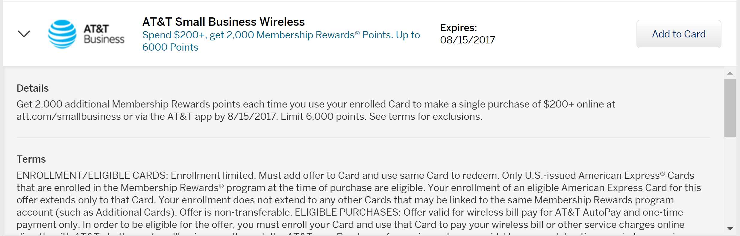 Today, a new Amex Offer popped up on a bunch of our business Amex cards, including The Business Platinum Card® from American Express: 2,000 Amex Membership Rewards points when you spend at least $200 with AT&T:
