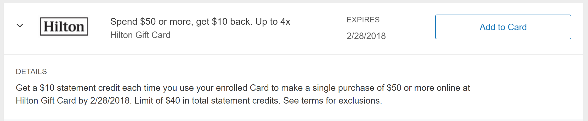 • Other restrictions: Limited to Hilton-branded hotels and Curio collection hotels, not for Hilton brands like DoubleTree, Embassy Suites and more. Check the terms for excluded brands. Excludes gift card purchases.