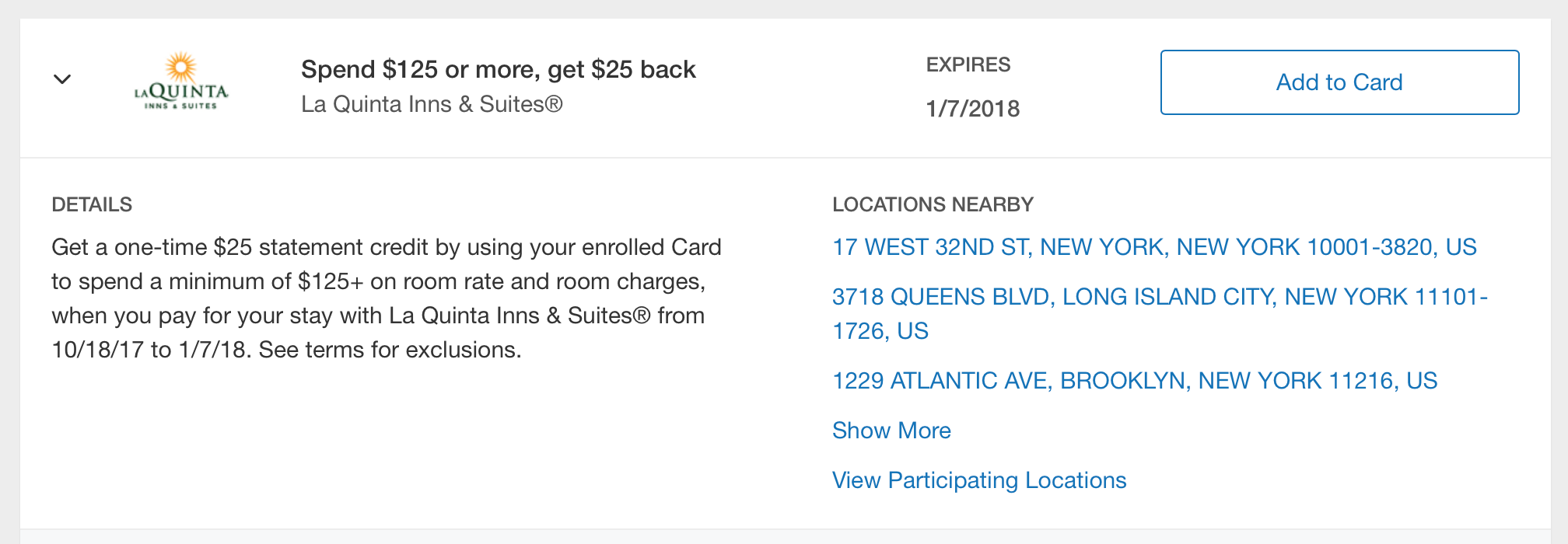 If you have multiple cards linked under the same username/password, note that there's a limit of one registration per Amex Offer per username/password. So, choose wisely if you have multiple targeted cards.