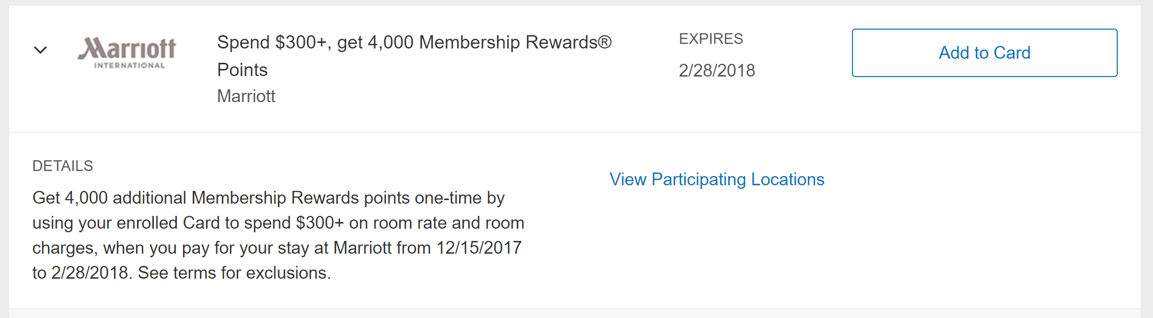 1. Marriott: Spend $300+, get 4,000 Membership Rewards Points