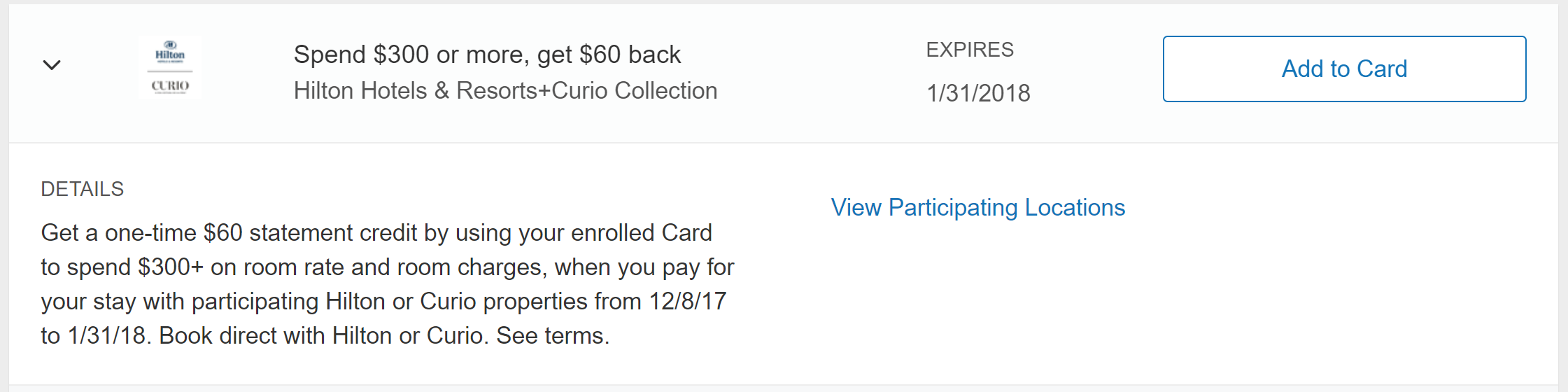 2. Hilton Hotels & Resorts + Curio Collection: Spend $300 or more, get $60 back