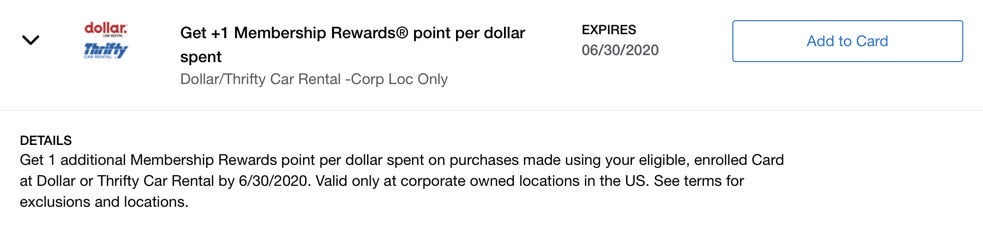 You can earn 1x bonus Membership Rewards points on rentals with Dollar and Thrifty that are paid for and completed by June 30, 2020. TPG values Amex points at two cents each, so you're getting an extra 2% back with this offer. This deal is only valid at corporate-owned Dollar and Thrifty locations in the U.S. You can see a full list of eligible locations here and you must pickup and return the rental to the same location.