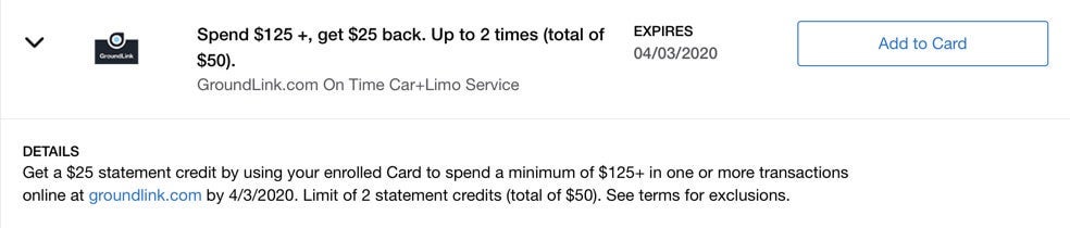 Through April 3, 2020, you can earn up to $50 back for eligible GroundLink purchases. For each $125 you spend at GroundLink's website you'll get $25 back and you can earn up to two $25 credits. Limo AnyWhere and Drive AnyWhere services are excluded from this offer.