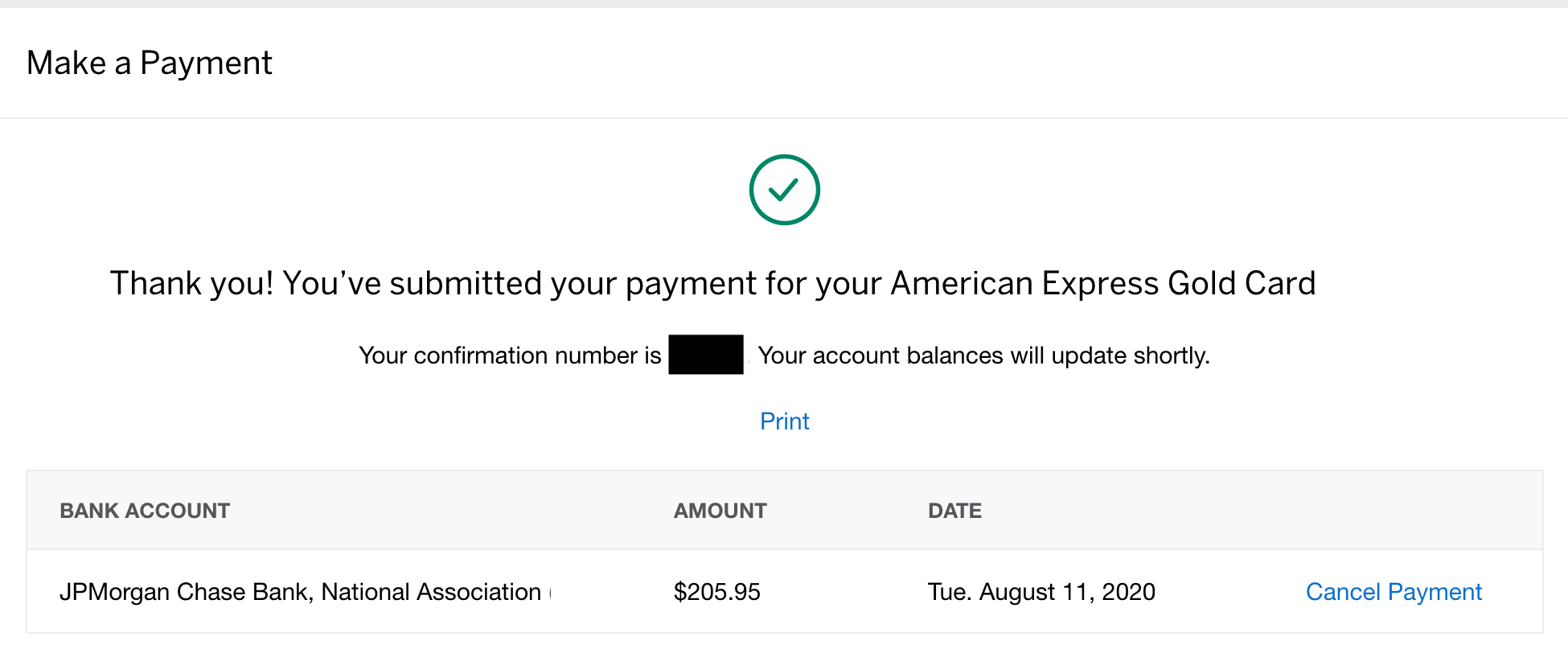 After selecting to pay off my total balance and hitting "Make a Payment," I was sent to this confirmation screen that mentioned my account balances would be updated shortly.